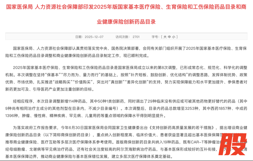 2025年12月7日,国家医疗保障局、人力资源和社会保障部公布了《国家基本医疗保险、生育保险和工伤保险药品目录(2025年)》(以下简称“国家医保药品目录”)。2025年国家医保药品目录将于2026年1月1日起执行。
